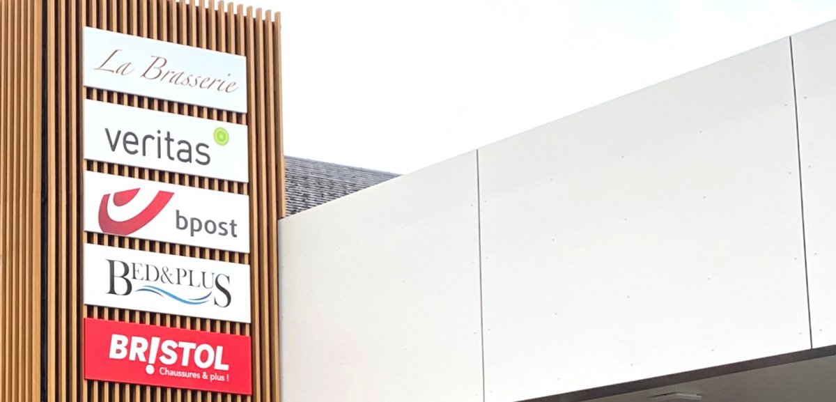 Deux structures verticales sur mesure regroupent désormais des caissons lumineux présentant les logos des enseignes partenaires, surmontés d’un lettrage relief éclairé “KNAUF”.