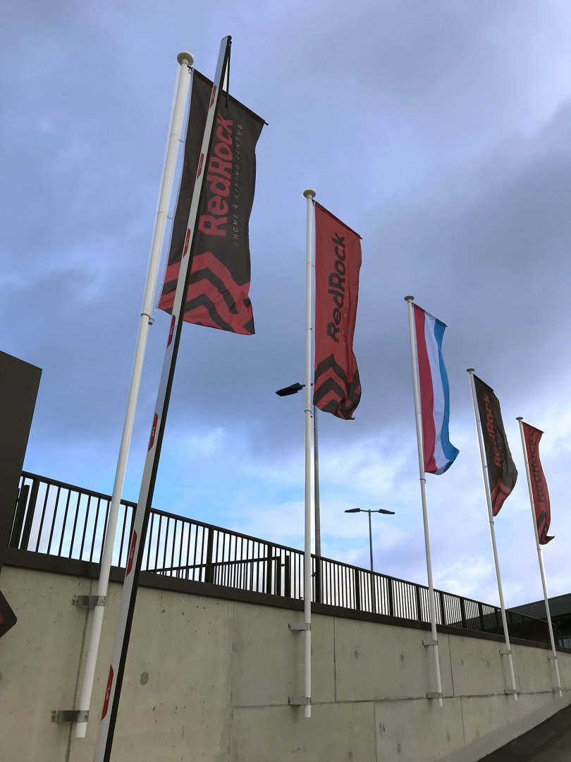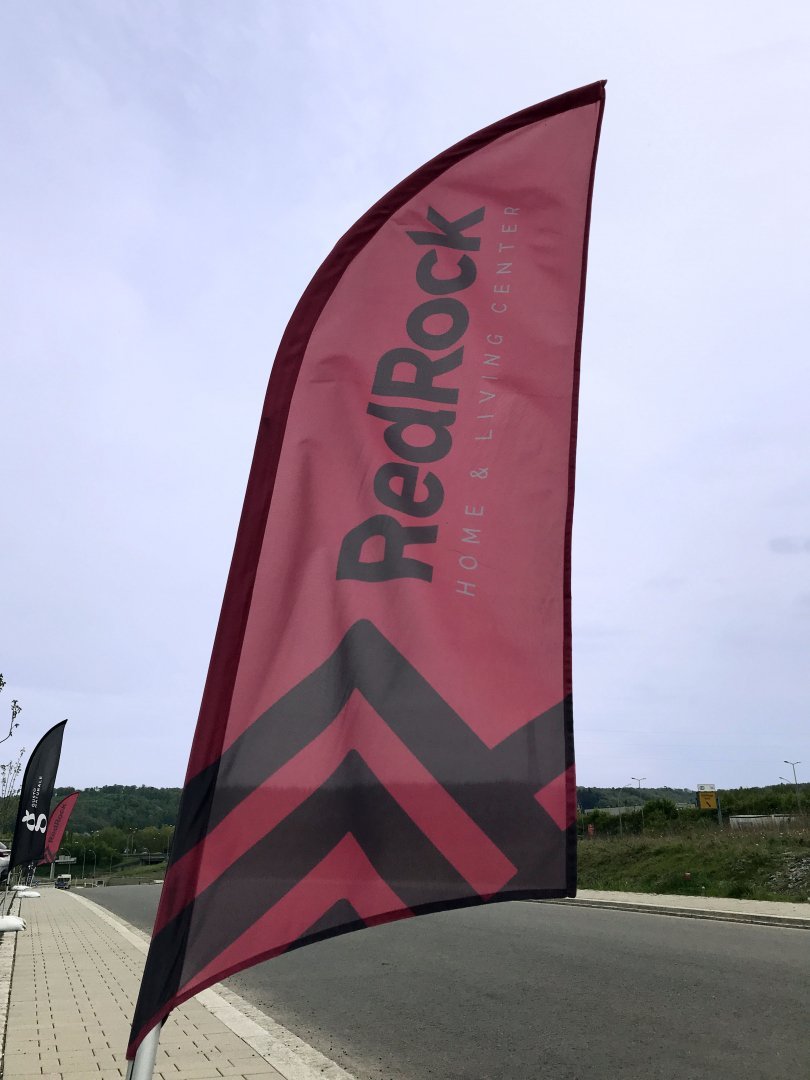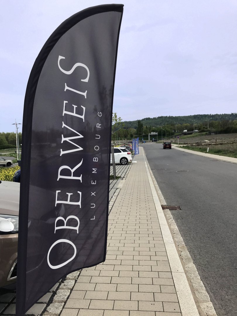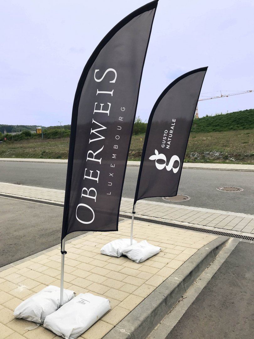 - Drapeaux et beach flags : parfaits pour l’extérieur, ils offrent un mouvement visuel dynamique et attirent l’œil.